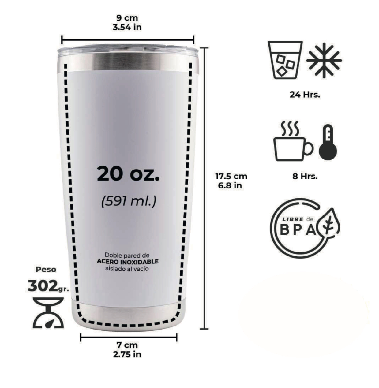 Termo de Acero Inoxidable 20 oz ( 591 ml ) con aislamiento doble vacio en pared para bebidas frías y calientes Tapadera hermetica Peso: 302 g Libre de BPA